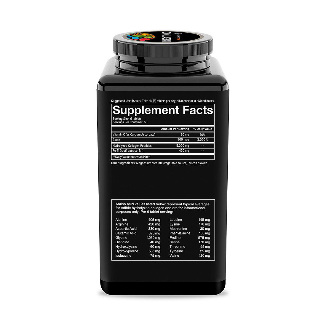Active Ingredients: Protein 5 g Vitamin C (as Calcium Ascorbate) 60 mg 70%DV Biotin 900 mcg 3,000%DV Hydrolyzed Collagen Peptides 5,000 mg ** Fo-Ti (root) extract (5:1) 420 mg.